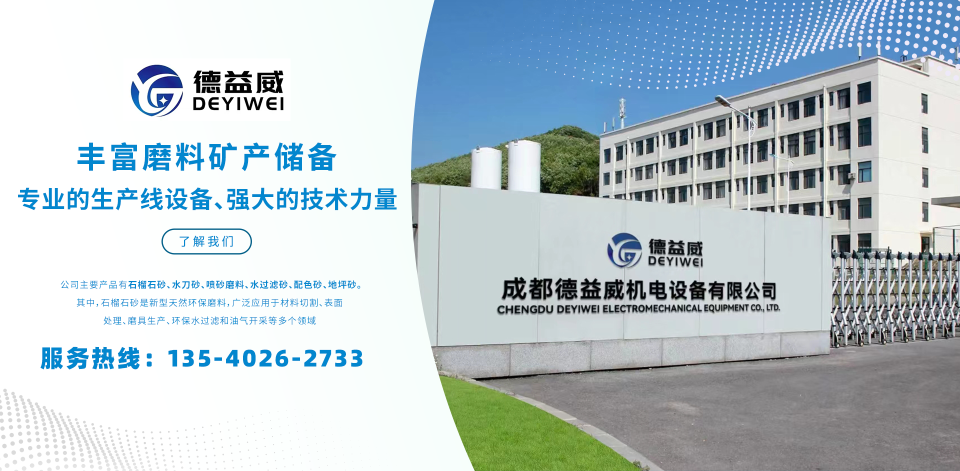 成都德益威機電設備有限公司是一家擁有豐富磨料礦產的企業,,經過近10年的發展,擁有豐富的礦產儲備、擁有專業的生產線設備、強大的技術力量、能及時的滿足客戶大量訂單的需求。         公司主要產品有石榴石砂、水刀砂、噴砂磨料、水過濾砂、配色砂、地坪砂。其中,石榴石砂是新型天然環保磨料,廣泛應用于材料切割、表面處理、磨具生產、環保水過濾和油氣開采等多個領域;其細粉是精密拋光工藝不可缺少的重要原材料,其產品在光電、軍工、航天、航空、機械、等領域均有廣泛應用;         公司始終堅持“服務客戶,合作共贏”的經營理念,不斷提升礦產資源的利用率,努力爭取節約國家礦產資源。